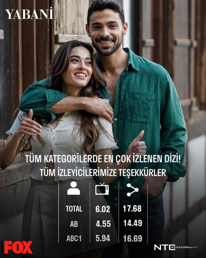 Yapımını NTC Medya’nın üstlendiği ilk bölümündeki başarısını devam ettirerek rakiplerine gözdağı verdi. Başrollerinde Halit Özgür Sarı, Simay Barlas, Dolunay Soysert ve Yurdaer Okur gibi çok önemliisimlerin yer aldığı Yabani dizisi total grupta 6,2, AB’de 4,55 ve ABC1 grubunda ise 5,94 reyting ile rakiplerine fark atarak Salı akşamının en çok izlenen dizisi olarak adını listelerin zirvesine adını yazdırmayı başardı. Bu büyük başarısıyla hem yayıncısının hem de yapımcısının yüzünü güldüren dizinin yönetmen koltuğunda Çağatay Tosun oturuyor. Senaryosunu Hilal Yıldız’ın yazdığı dizi ilk olarak 12 eylül 2023 tarihinde seyircisine merhaba dedi.