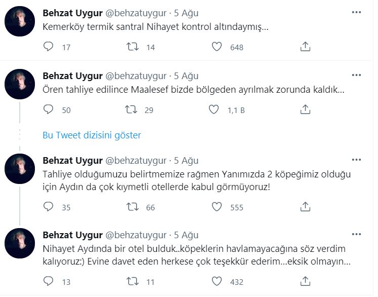 Güvenlik nedeniyle Ören'den tahliye edilen vatandaşlardan olan Behzat Uygur köpekleriyle kalacak otel bulamayınca sosyal medya hesabından sitemli bir paylaşım yaptı. Ünlü sanatçı Uygur, "Ören tahliye edilince Maalesef bizde bölgeden ayrılmak zorunda kaldık… Aklım bıraktığım bölgenin köylüsünde… Allah yardımcıları olsun… Tahliye olduğumuzu belirtmemize rağmen yanımızda 2 köpeğimiz olduğu için Aydın da çok kıymetli otellerde kabul görmüyoruz!" ifadelerini kullandı. Ünlü sanatçının paylaşımına çok sayıda yorum yapıldı. Birçok kişi Uygur'u evinde ağırlayabileceğini söyledi.